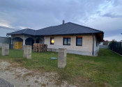 Súčasný stav domu podľa projektu - dispozícia: vstupná chodba, obývacia izba s predprípravou na krb, kuchyňa, komora, dve izby (každá s kúpeľňou), technická miestnosť, samostatné hosťovské WC, garáž pre jedno auto (druhé auto na pozemku pred garážou).