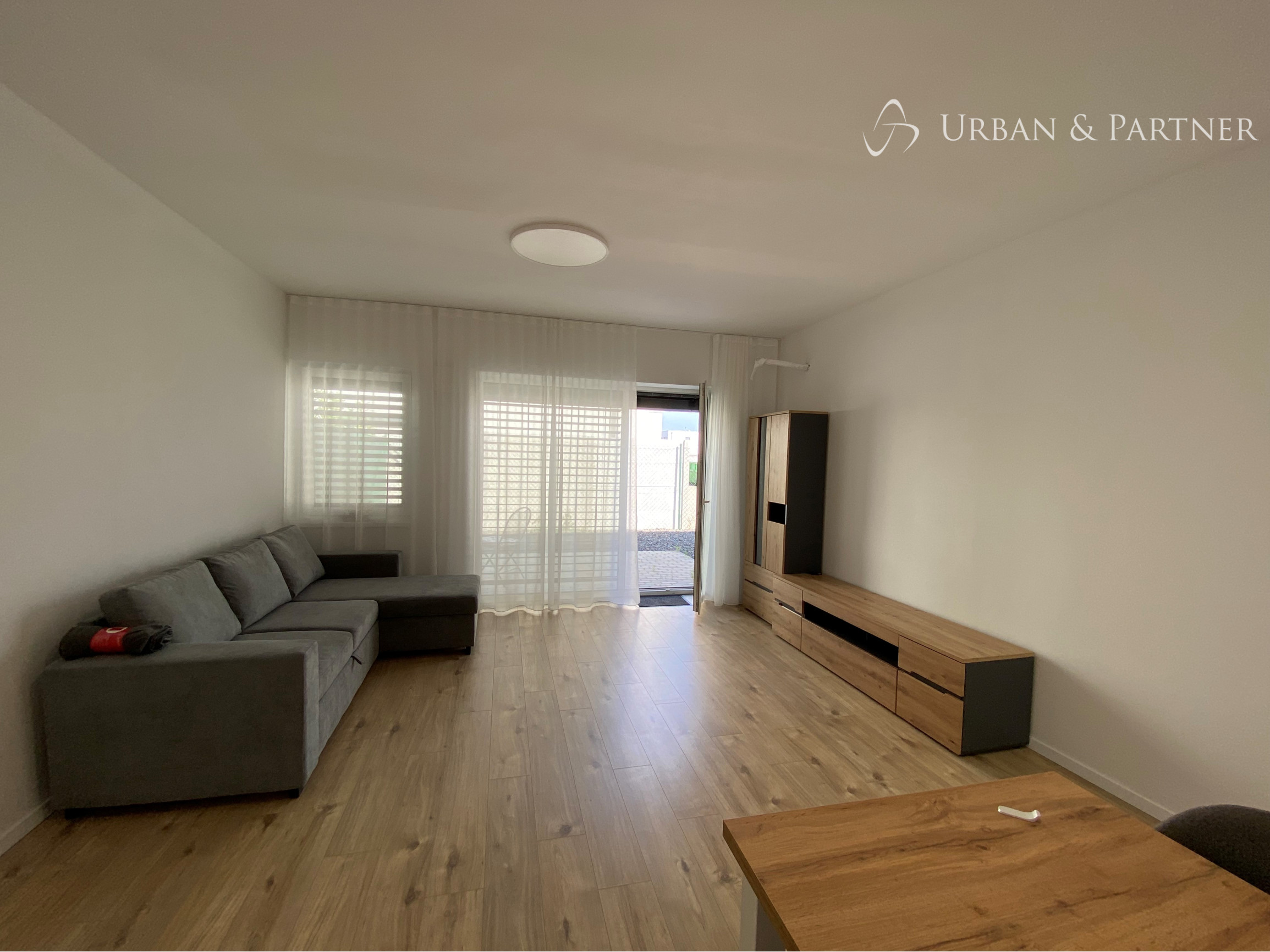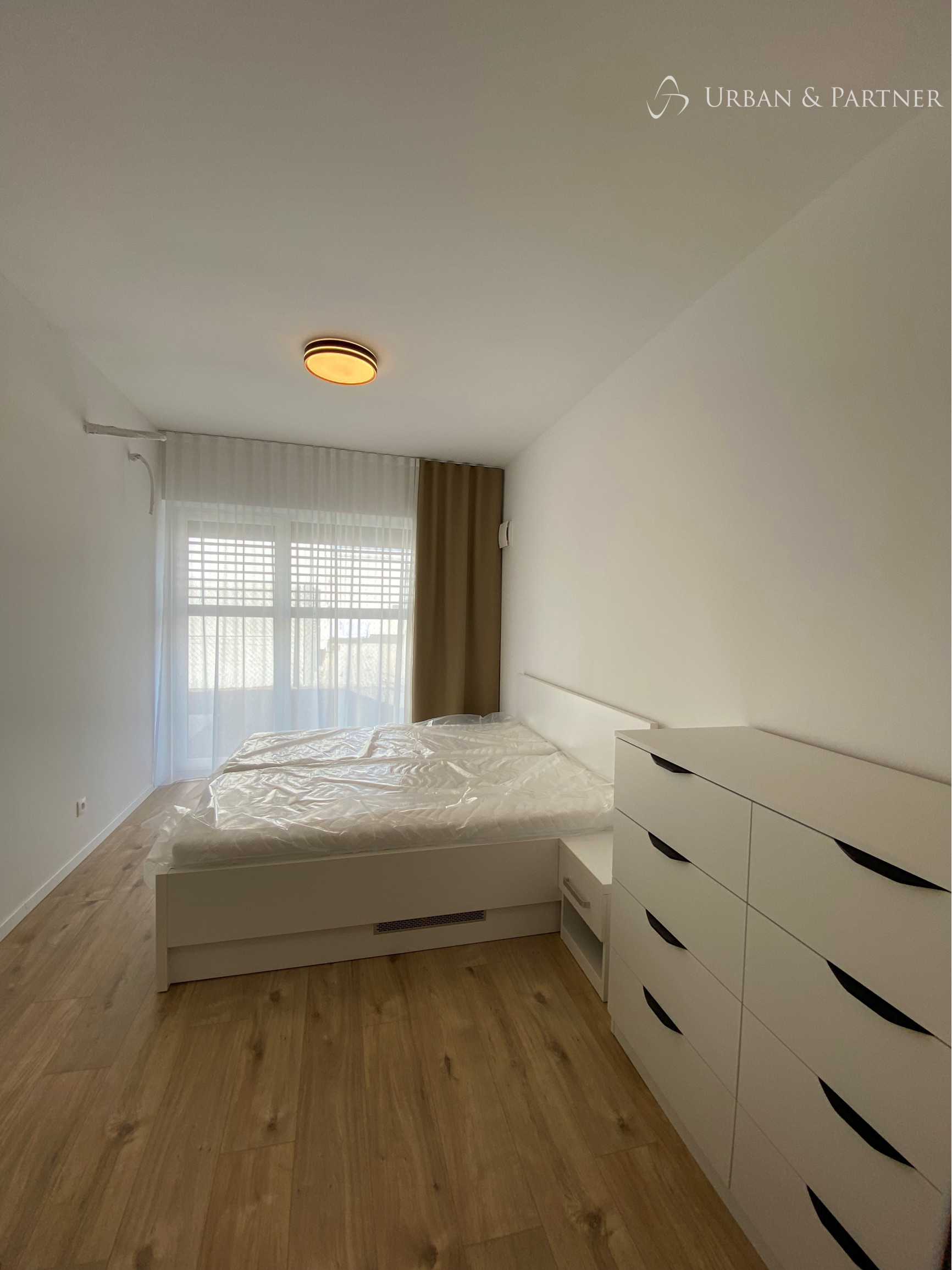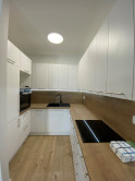 Byt je kompletne zariadený novým nábytkom vrátane spotrebičov v kuchyni (chladnička, mraznička, rúra, elektrická varná doska).