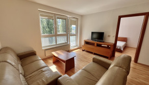 Byt sa prenajíma zariadený: kuchynská linka so spotrebičmi, jedálenský stôl so stoličkami, v obývačke kožená sedačka, konferečný stolík, komoda a TV. V spálni manželská posteľ, skriňa a komoda. V predsieni vešiaková nástenná zostava s botníkom a v kúpeľni je k dispozícii práčka.