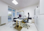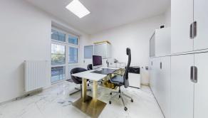 Dispozíciu tvorí: priestranná vstupná hala, v ktorej sa nachádza zasadačka, ktorá je oddelená sklenenými priečkami (ľahko demontovateľné), z haly sa vchádza na jednej strane do sociálneho zariadenia zvlášť ženy a zvlášť muži spojené spoločnou chodbou s umývadlom, ďalej je vstup do jednej miestnosti s balkónom orientovaný do menšieho zeleného dvorčeka, z haly sa na druhej strane vchádza do 3 samostatných a vzájomne prechodných miestností a ďalej do ďalšej samostatnej miestnosti. Z priloženej video prehliadky získate maximálny pohľad na skvelú dispozíciu.