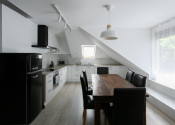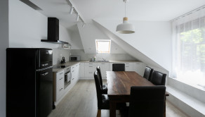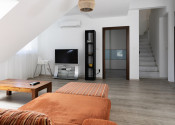 - na prízemí vstupná chodba, z ktorej je vstup do samostatného WC s umývadlom, samostatnej kúpelne s vaňou, umývadlom, miestom na pračku a samostatným plynovým kondenzančným kotlom, ďalej z chodby je vstup do priestrannej obývacej izby spojenej s kuchynskou a jedálenskou časťou, ďalej samostaná spálňa s priestranným zabudovaným šatníkom,