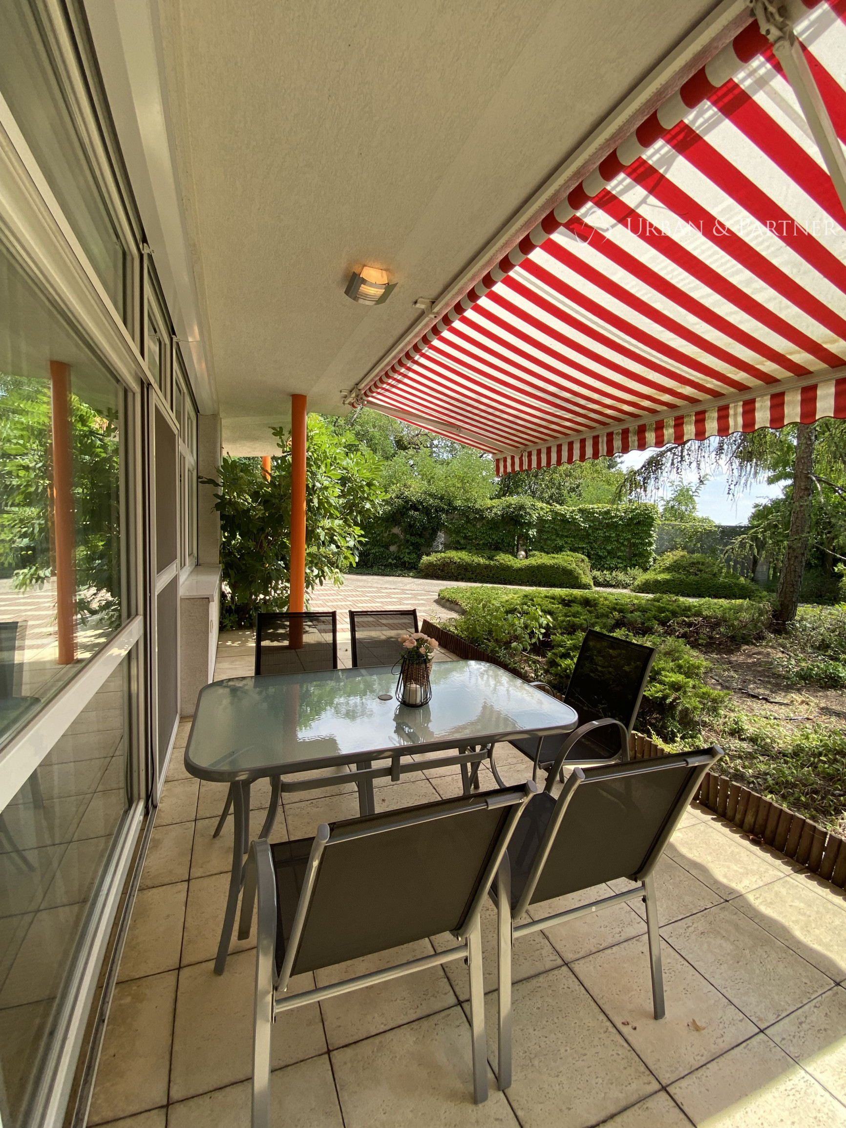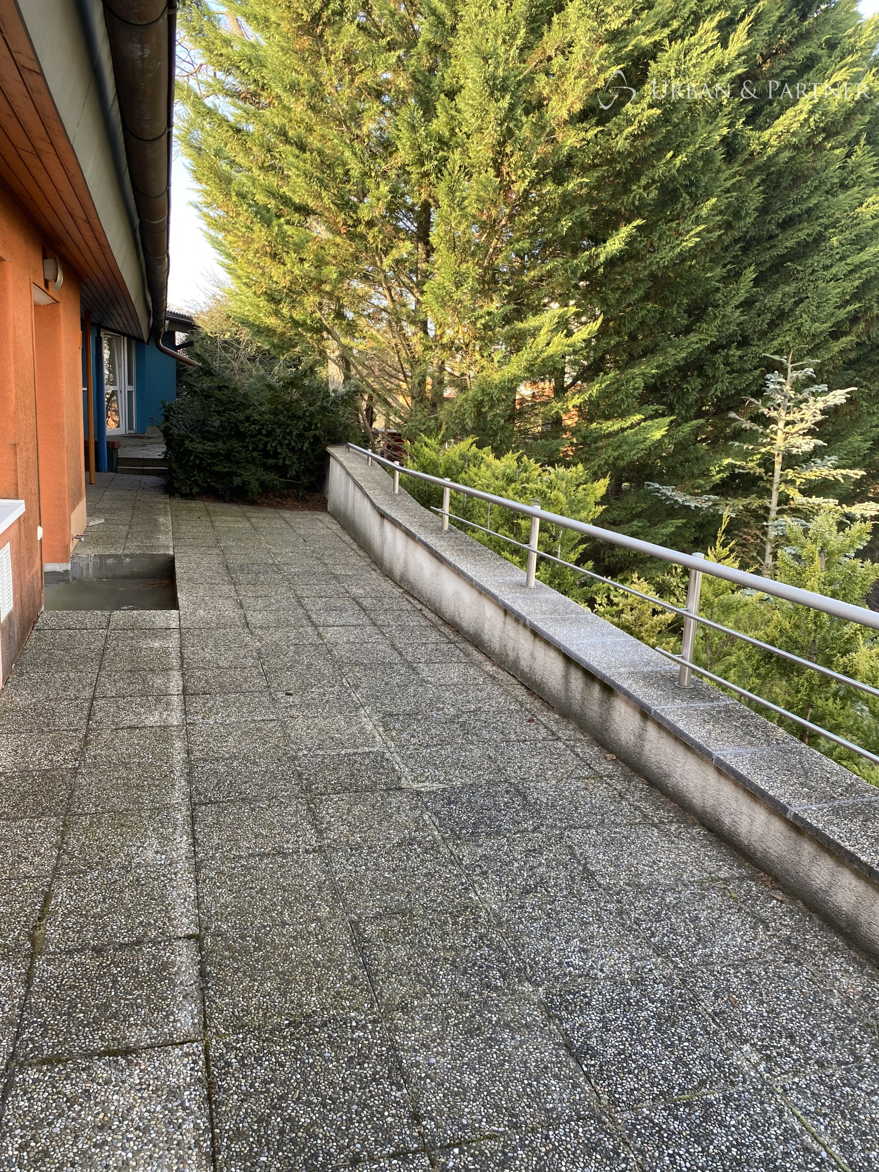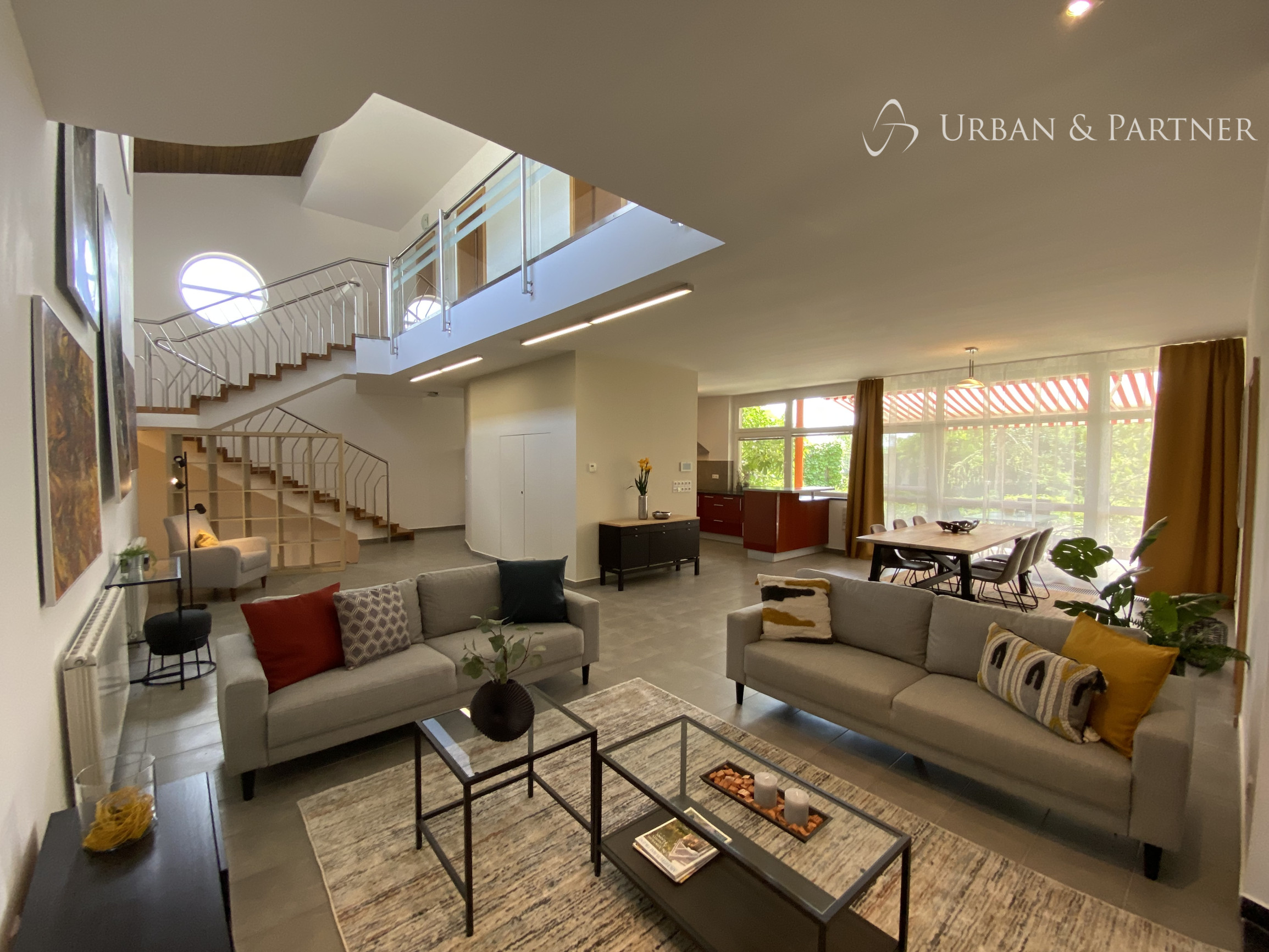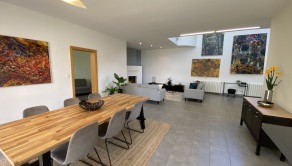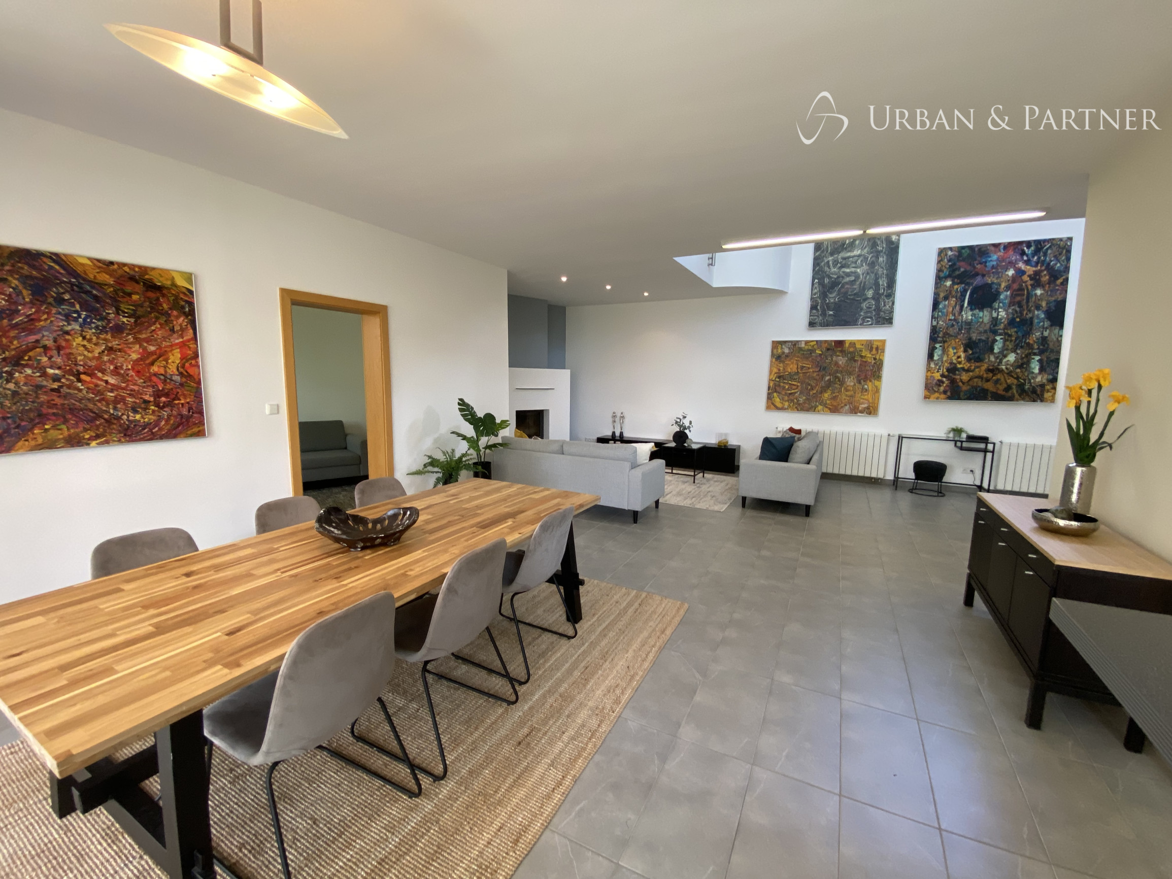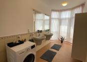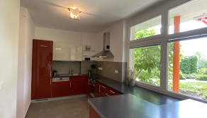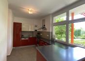 - na prízemí vstupná hala s hosťovským WC, veľká pivnica s úložným priestorom, priestranná obývačka s jedálenskou časťou a s krbom spojená s kuchyňou kompletne vybavenou všetkými spotrebičmi s priamym výstupom na terasu s markízou a do menšej záhradky, jedna samostatná izba